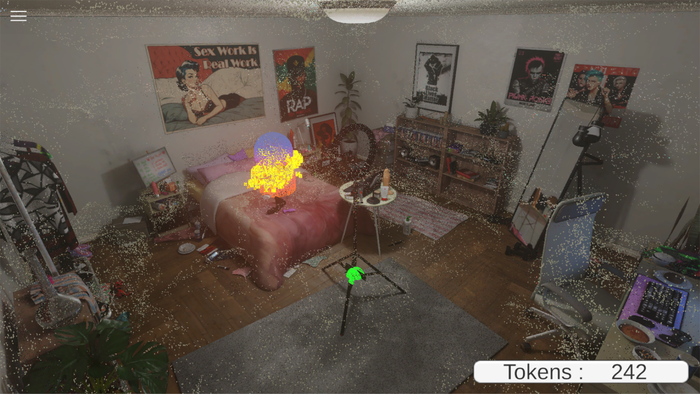 "Show me yours" est une installation de l'exposition "Sexe, Désirs, Data" (Prix Numix 2024) par le Studio PHI en Juillet 2023, et qui traîte de nos relations entre numérique et sexualité.e.s. Je suis intervenu sur plusieurs installations, en particulier sur Show Me Yours, qui est une oeuvre de réalité augmentée parlant des relations des travailleu.r.ses du sexe via internet. L'espace de visite est une reconstitution d'une chambre à coucher très neutre, sans décorations. Plusieurs appareils électroniques sont présents : un appareil photo et un téléphone sur trépieds, une tablette, un caméscope, équipés d'une caméra de suivi de position. Au plafond est installé un réseau de LED reconnu par les caméras. C'est le système de Antilatency, qui a également été utilisé sur les projets Ciel à Outrance et L'infini.
