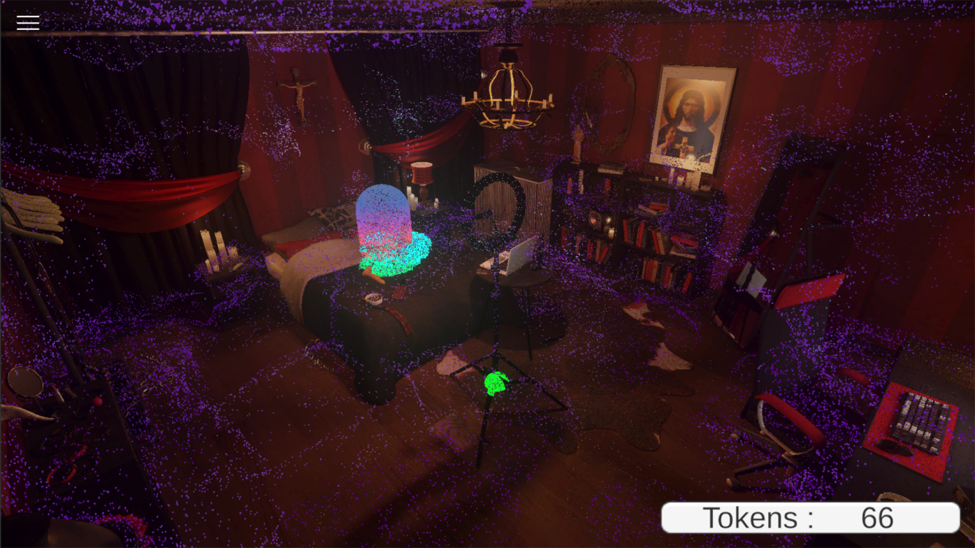 En regardant et en bougeant les écrans, les visiteur·euse·s avaient accès à une version virtuelle de la chambre, dans le style des sujets de l'oeuvre, qui sont inspirés de leurs univers.